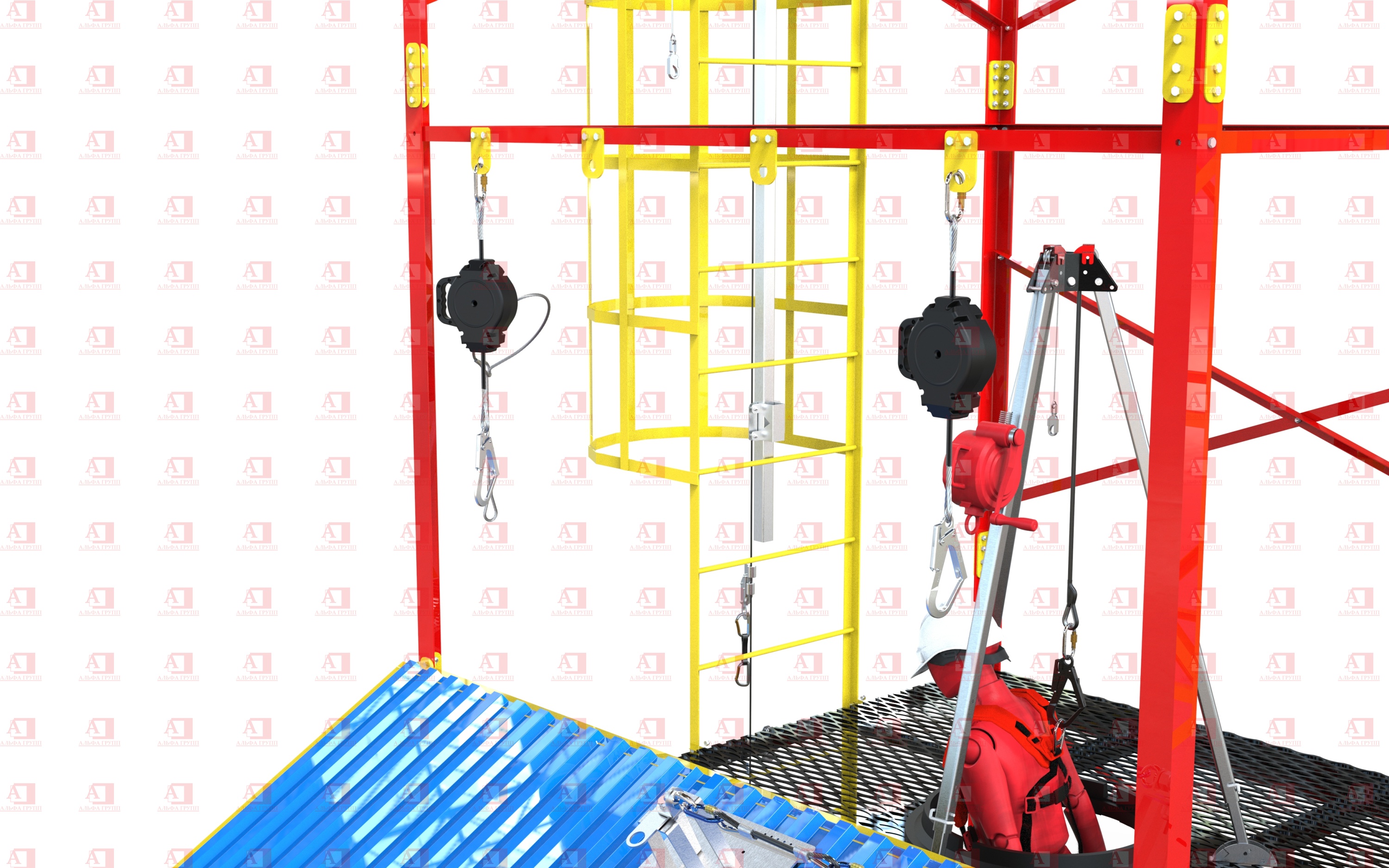 •  Работы при обслуживании путей мостового крана (использование стационарной анкерной линии или двух плечевого соединительно-амортизирующего устройства);