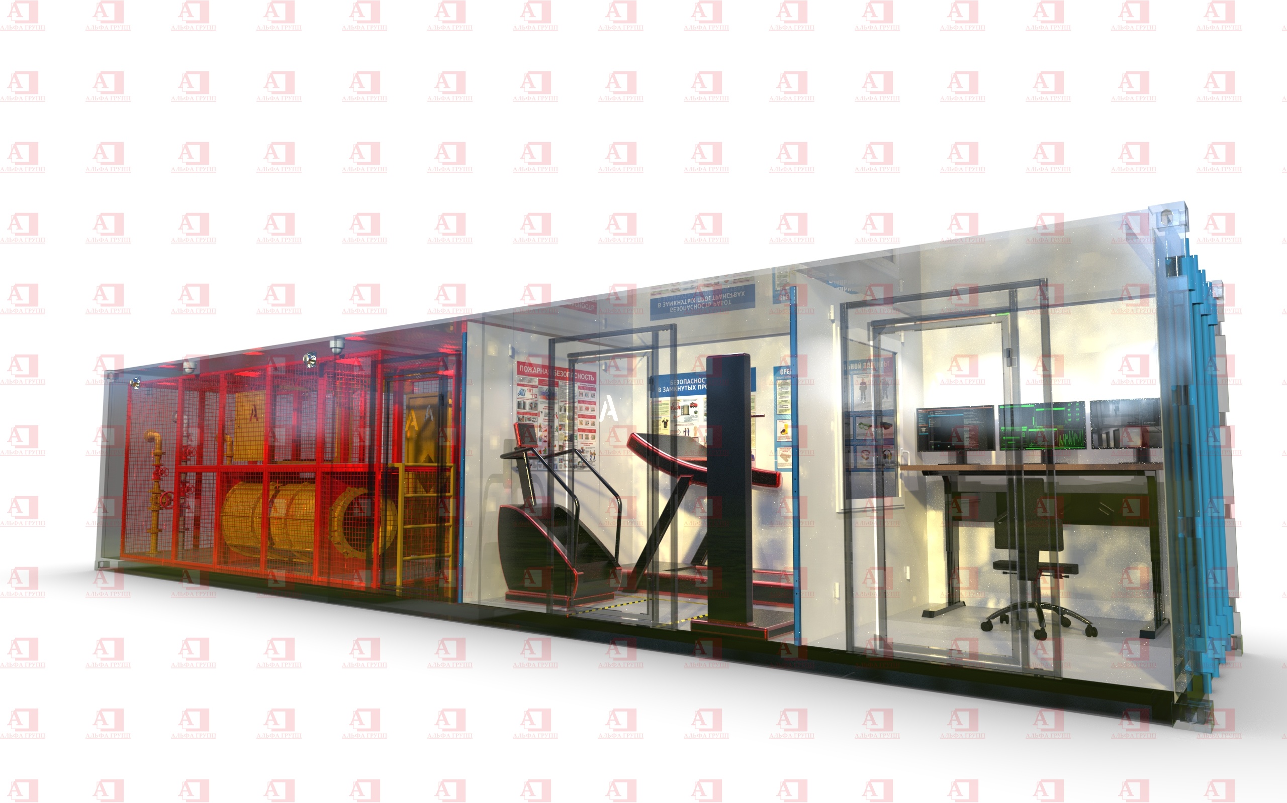 1. Зона управления: Централизованный пункт управления всем комплексом. Оборудована компьютеризированным пультом для точного контроля и программирования параметров тренировки (температура, плотность и скорость подачи дыма, длительность этапов). Обеспечивает визуальный мониторинг происходящего в зонах через систему видеонаблюдения, голосовую связь с обучающимися и мгновенную активацию всех аварийных протоколов.